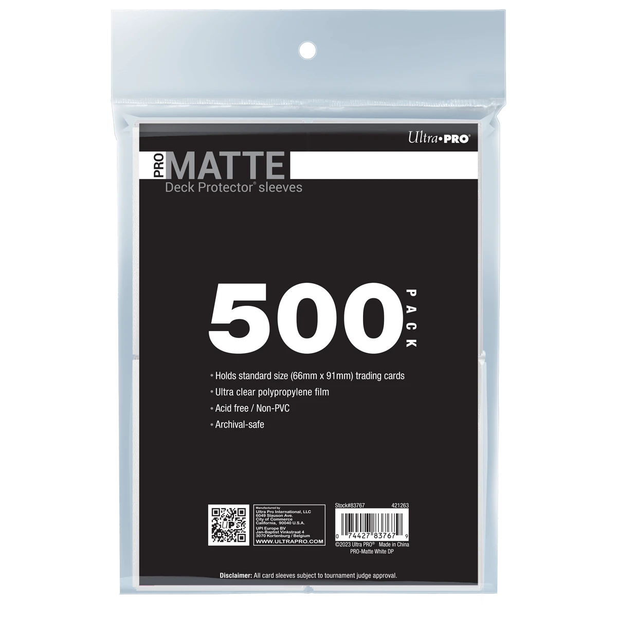 Made with acid-free, non-PVC polypropylene materials, our PRO-Matte Deck Protector® sleeves will keep your cards safe from scratches and wear. The matte finish helps minimize glare during play, while the textured matte back keeps cards from sticking together and provides a smooth shuffle. Each pack includes standard size sleeves, which fit both Pokémon and Magic: The Gathering trading cards. You’ll know it’s Ultra PRO quality when you see the heat transferred holographic stamp. Available in 6 colors: Black, Blue, Clear, Green, Red, and White.